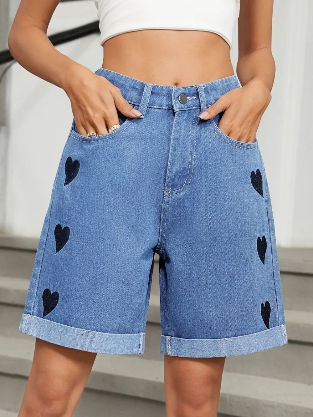 Heart Pattern Rolled Hem Denim Shorts – Cute & Casual | MYN2O