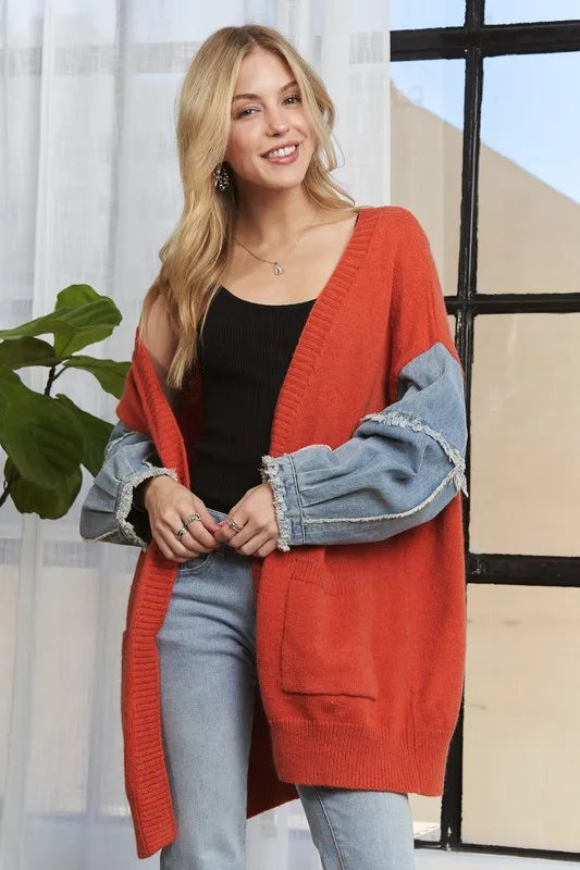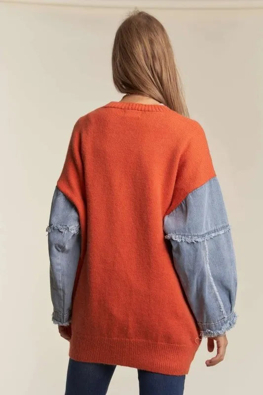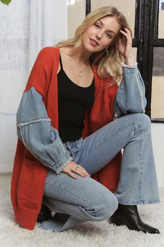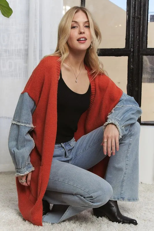 ADORA Full Size Frayed Denim Sleeve Sweater Cardigan Plus Size