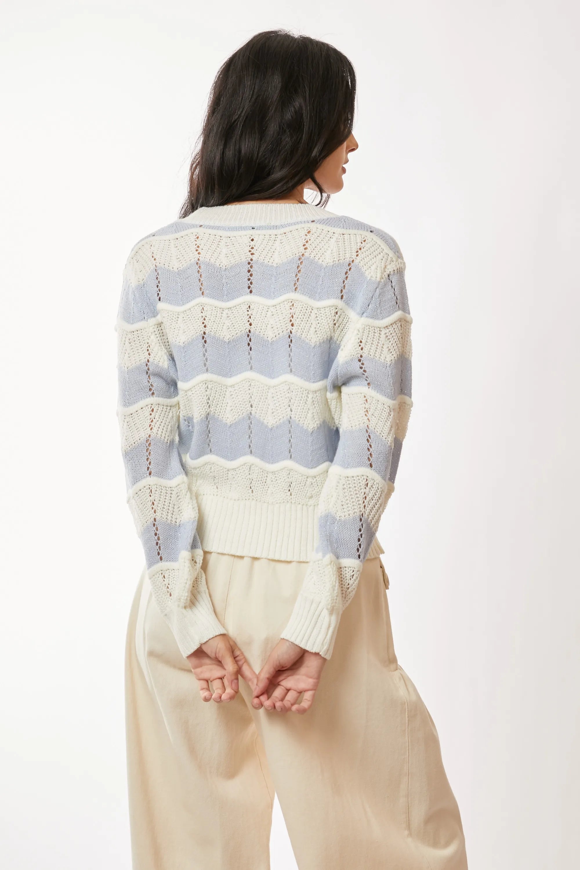 This charming cardigan features a beautiful wave-striped pattern in light blue and white, creating a fresh and elegant look. Made from high-quality knit material, it offers both comfort and style. The cropped length and button-up design make it versatile for various outfits. The balloon sleeves add a modern touch while the ribbed trim provides a polished finish. Perfect for spring and summer layering, this cardigan combines classic style with contemporary details. The lightweight construction makes it ideal for seasonal transitions.