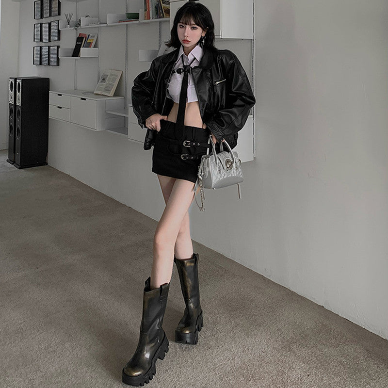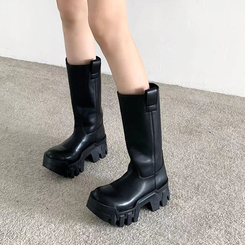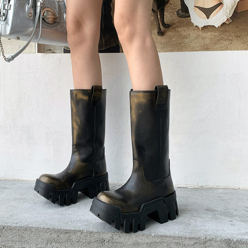 Women's Thick-soled Brushed Color Mid-cut Motorcycle Boots Round Toe All-match